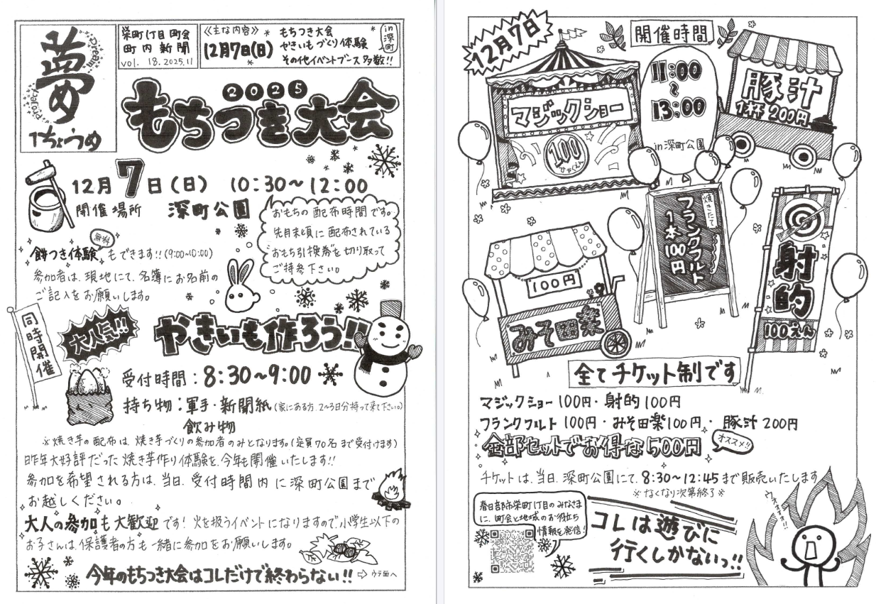 町内新聞 第18号のお知らせ イベント X Facebook はてブ Pocket LINE コピー 2025.12.112026.01.25 ウィンターフェスティバルにグレートアップしたもちつき大会についてのお知らせ号です。昨年にひきつづき、公表だった焼き芋づくりに加え、今年は屋台も登場し、楽しいイベントとなりました!